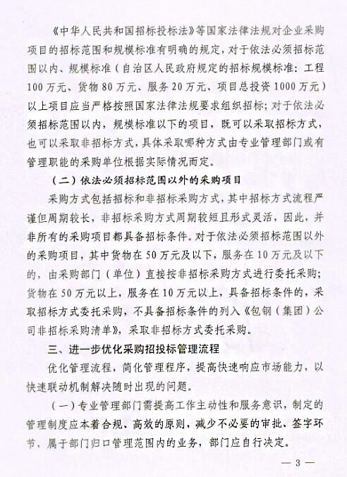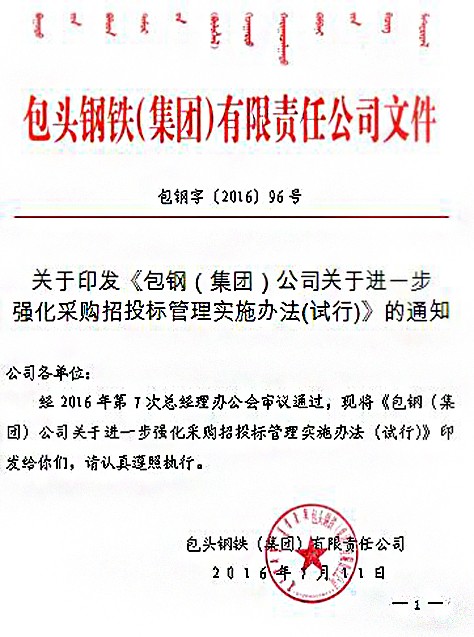 下一條:關(guān)于印發(fā)《包鋼(集團)公司關(guān)于進一步強化采購招投標(biāo)管理實施辦法(試行)》的通知